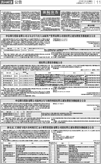 中信银行股份有限公司义乌分行与光大金瓯资产管理有限公司债权转让通知暨债务催收联合公告
