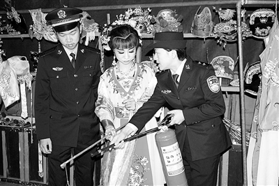 日前,临海市公安局江南派出所开展大型群众集会场所消防安全检查。图为民警在社戏后台检查,并向戏曲演员讲解灭火器使用方法。