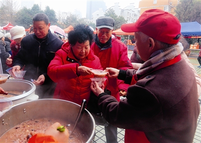 昨日上午,杭州市萧山区北干街道银河社区文化广场上热闹非凡,社区志愿者们将刚刚煮好的腊八粥一碗碗分给居民。香喷喷热乎乎的腊八粥让大家感受到浓浓暖意。