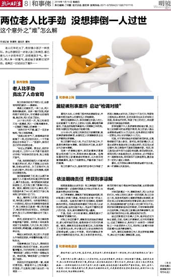 于是,走到某段路的人行道与机动车道交界处时,两人不顾路上过往车辆,当街比试手劲。为了压倒对方,在比试过程中,两位老人互相推搡,结果双双摔倒在地。