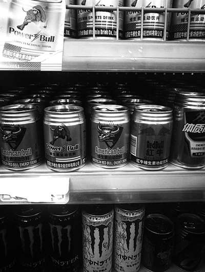 记者跟随金华市市场监管局稽查支队来到金东区,走进富元生活超市,执法人员发现了2款近似红牛——“power bull”“american bull”,和正品“red bull”十分相似,只是售价稍低。“初步判断这两款产品傍名牌,具体确认还需进一步调查。”执法人员说。