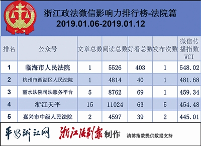 作为名次变动最为频繁的一个榜单,这一次法院榜单前三名又“大换血”了。这次前三名依次是:“临海市人民法院”“杭州市西湖区人民法院”和“丽水法院司法服务平台”。虽然名次有高低,但整体看来,各公号的WCI值非常接近。可见,各公号的传播影响力不相上下。看来,想要脱颖而出,各公号小编还得别出心裁、多多费心了。