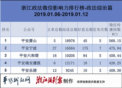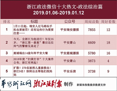 本期政法委榜上,“平安萧山”依然位居榜首。来自“平安瑞安播报”的《1月11日起,瑞安人过马路玩手机也要被罚!还有这些行为需要注意……》则获得最高阅读量。低头玩手机过马路导致事故频发,有这个坏习惯的人可长点心吧!