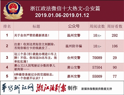 本期公安榜上,前三名依次是“温州交警”“温州防诈骗”“金华交警”。值得一提的是,此次两篇10万+美文均出自公安榜单。它们分别是“温州交警”的《关于全市严管的最新消息!》和“温州防诈骗”的《注意!收到这类短信立刻删除,否则你银行卡的钱就没了……》,前一篇关于安全出行,后一篇关于防诈骗。要过年了,无论是人身安全还是财产安全,大家都要多留个心眼哦!