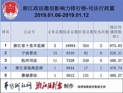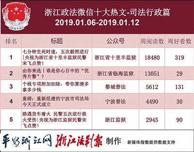 本期司法行政榜上,前三名依次是“浙江省十里丰监狱”“宁波普法”“杭州司法”。其中,“浙江省十里丰监狱”的《七分钟生死时速,五次毅然逆行|央视为浙江省十里丰监狱民警宋飞点赞!》一文获最高阅读量和点赞量。此文展现了省十里丰监狱民警宋飞勇救火灾的事迹,彰显了人民警察的社会担当,值得点赞!