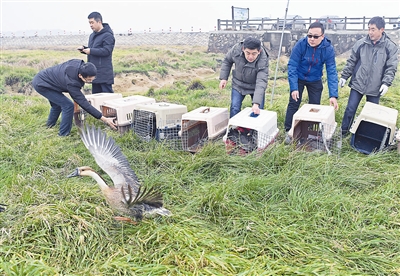 当日,江西省野生动植物救护繁育中心、天津市野生动物救护驯养繁殖中心在江西鄱阳湖国家级自然保护区将16只被救治的珍稀候鸟成功放飞。其中1只东方白鹳为国家一级保护动物,2只大天鹅、3只鸳鸯为国家二级保护动物。新华社 万象 摄