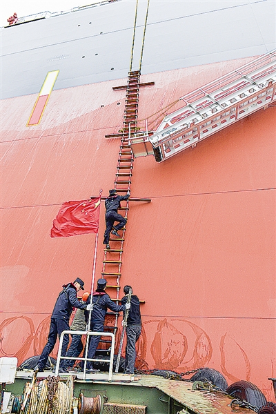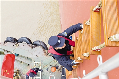 “握紧软梯绳子,踩稳了!”昨日,舟山出入境边防检查站岱山分站的民警们,对一艘停靠辖区海上锚地的30万吨级空载外籍船舶进行入境前的边防检查,面对近20米高的“海上铁墙”,带班民警吴侠飞再三叮嘱同事们注意安全。登上船后,民警们询问船舶相关信息、检查船员证件、开展船体检查……有条不紊地展开各项边防检查工作。