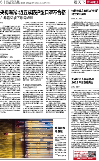 记者随机购买了6款口罩进行检测,结果显示其中没有标明任何执行标准的3款口罩,以及1款执行卫生标准的产品,过滤效率大多在30%、40%左右;防护效果也大多在30%到60%之间。这样的结果意味着,这4款口罩产品在中度及以下污染环境下,都难以起到有效的防护效果,更别说在重度雾霾污染环境下使用了。