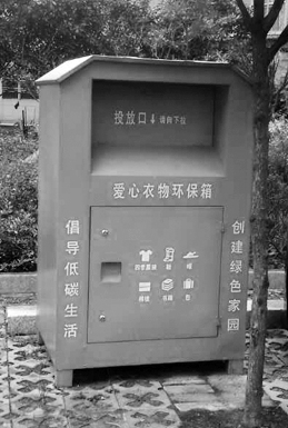 在溪滨佳苑小区内,记者发现了搁在单元楼垃圾桶边上的4个“爱心衣物环保箱”,外观形似“绿房子”,但箱体上没有注明单位、公司名,也没有任何联系方式。