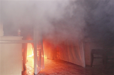 记者通过视频监控看到,仅仅过了2分多钟,挂在椅子上的衣服就烧了起来,随后,纱幔也被点燃并“帮助”火势迅速蔓延开来。