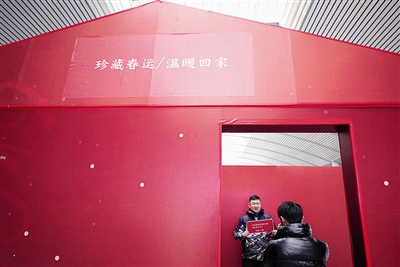 1月28日,在济南西站候车大厅,准备回家的旅客在“春运照相馆”拍照。