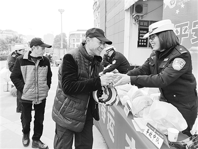 自2019年春运启动以来,平阳交警开展了以“平安春运,交警同行”为主题的交通安全宣传活动。图为平阳交警为过往群众送上安全头盔和热腾腾的姜茶。