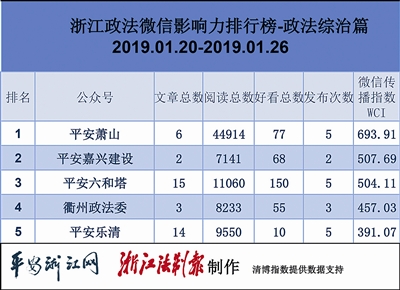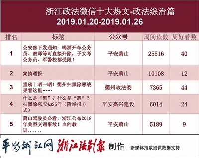 本期政法委榜,前三分别是“平安萧山”“平安嘉兴建设”和“平安六和塔”。“平安萧山”有6篇热文上榜,其中最吸睛的是《公安部下发通知:喝酒开车公务员、教师等可直接开除,子女考公务员、军警校都受限!》,“开车不喝酒,喝酒不开车”,年关聚会多,还望大家谨记于心。