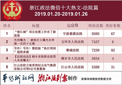 本期法院榜,“宁波慈溪法院”脱颖而出,公号热文《“壹江城”项目处置工作有了新进展》引起广泛关注,收获阅读数近万。“玉环市人民法院”表现亮眼,《失信曝光|被执行人曝光名单第一百四十五期》一文收获阅读数7437。被这么多人围观也是够丢脸了,大家千万不要当“老赖”。