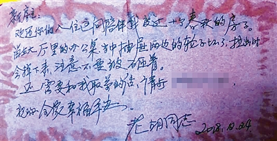 本报讯 “新房主:欢迎你入住这间陪伴我度过十个春秋的房子。留在大厅里的办公桌当中抽屉两边的轮子坏了,拉出时会掉下来,注意不要被砸着。还需要和我联系的话,请打……祝你全家幸福平安。——老胡同志”。近日,温州鹿城区法院执行干警李超和同事,来到瑞安市隆山确认一处房产是否腾空时,在门边的柱子上见到了一张写着上述内容的红色纸条。