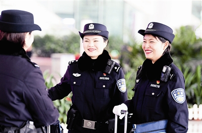 1月29日,合肥铁路公安处乘警支队女警谢肖鹏(中)、周丹琳(右)在合肥南站与同事交流。