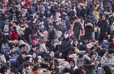 2月10日,武汉铁路民警周晨宇在武汉站候车室值勤。武汉站、武昌站、汉口站全天预计发送旅客超过30万人。