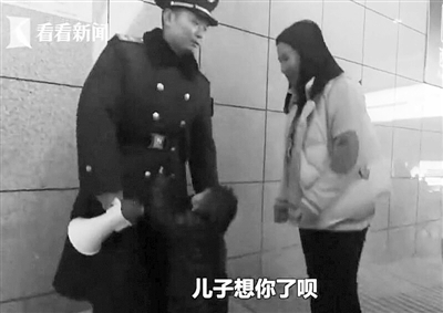 9日,在上海西站执勤的武警谭俊泽,遇到前来探望的妻儿。2岁半的儿子连续三次索要拥抱,而忙着给旅客指路的他,只能碰碰儿子的小手。直到换岗后,他才与妻儿短暂团聚。谭俊泽说:“在岗位上不能抱孩子,心里特别难受。”