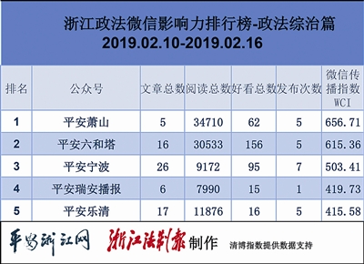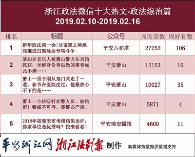 本期政法委榜,位居第一的依然是“平安萧山”,紧追其后的是“平安六和塔”和“平安宁波”。而最受欢迎的美文是来自“平安六和塔”的《新年政法第一会|以雷霆之势纵深推进扫黑除恶专项斗争》。此文阐述了新的一年,杭州市有关部门对扫黑除恶专项斗争工作的部署,获得广泛关注。