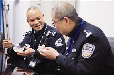 | 曾仁仲和叶波在值班室内吃汤圆庆祝元宵节 |