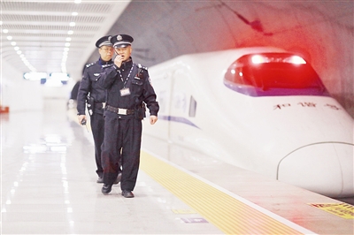 | 2月19日,警长曾仁仲(前)和民警叶波在站内巡查 |