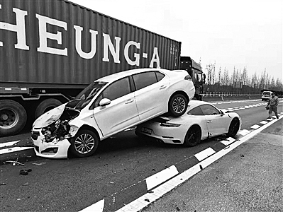 本报讯 23日13时45分左右,在G15甬台温高速往宁波方向1509K附近,由于车流量较大出现了车辆排队缓行的情况,此时,一辆白色保时捷小车行经此处,径直向队尾一辆雪铁龙白色小车撞了过去,最终导致一起三车追尾事故。其中雪铁龙小车被顶得调了个头,并“骑”在保时捷小车上,两车停于主车道,雪铁龙车上一名乘客受轻微伤。