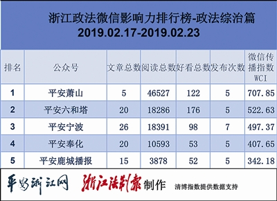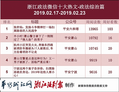 本期政法委榜,“平安萧山”连续三期登顶榜一。来自“平安六和塔”的《张仲灿:发扬斗争精神打一场扫黑除恶的人民战争》一文则在热文榜中位列第一,扫黑除恶斗争激流勇进,大家对此话题的关注度也是连连攀升。
