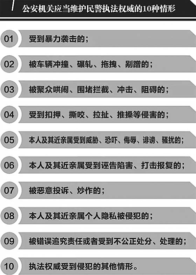 《公安机关维护民警执法权威工作规定》明确了公安机关应当维护民警执法权威的10种情形,尤其是根据现阶段民警执法遇到的侵害实际,加入了“被车辆冲撞、碾轧、拖拽、剐蹭的”“受到扣押、撕咬、拉扯、推搡等侵害的”等情形,具有很强的指导性和针对性。
