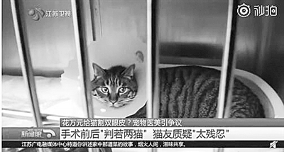 近日,江苏南京市一名养猫人为让宠物猫变得更美,竟花1万元给它割了双眼皮。据悉,宠物整形来自韩国,还包括裁耳、拉皮等,目前国内很少有宠物医院公开做这些项目。不少兽医认为,这类手术只能满足主人的喜好,对猫狗本身无益,甚至会带来伤害。