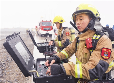 “现场火势控制,发起总攻。”11时30分,随着总指挥的一声令下,演练总攻开始,只见现场的消防车和水炮瞬间出水,多辆消防机器人开始向目标区域推进,对目标装置形成高、中、低三个层面的作战态势。