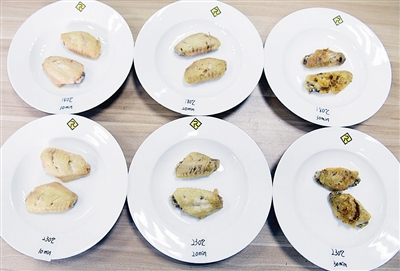 实验人员何婷去菜场购买了新鲜鸡翅,刷油后放入烤箱中,将温度、时间设置到实验状态。结果,烤制10分钟的鸡翅通体金黄色,没有烤焦痕迹;烤制20分钟的鸡翅部分烤焦;烤制30分钟的鸡翅则大部分都烤焦了。