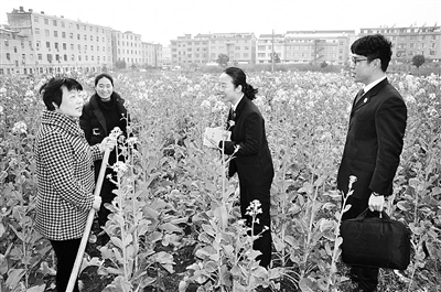 天台县法院充分发挥审判职能作用,主动延伸司法服务,法官从“案头”奔向“田头”。图为近日,苍山法庭干警向正在田地里务农的群众了解农事情况。