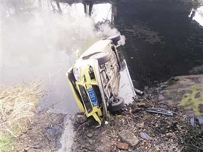 黄色大众车侧翻在河床上,车身右侧着地,车头冒着白烟,车身后半部分浸入水中。车窗紧闭,李晓钟透着窗玻璃也看不清车内人员情况。而河道里堆积了不少淤泥,事故车将会越陷越深,后果不堪设想。
