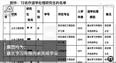 近日,广州大学对72名研究生作出退学处理,退学原因均为:最长学习年限内未完成学业。广州大学宣传部老师称,这是按照研究生学习管理规定作出的决定,会由学院通知到学生个人。