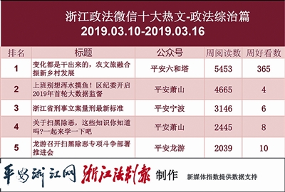 本期政法委榜,前三分别是“平安六和塔”“平安萧山”“平安宁波”。热文榜上,“平安六和塔”的《变化都是干出来的,农文旅融合振兴乡村发展》引起广泛关注,收获阅读数5453。倾听民声、服务民生,杭州开展的“走亲连心三服务”活动很暖心。
