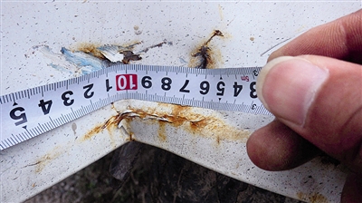“长4厘米,宽2厘米,形状规则,呈方形……”仔细对凹陷处进行测量后,余立希又将目光移到旁边拼装起来的三轮车,很快找到了造成这个凹陷的可疑物体——