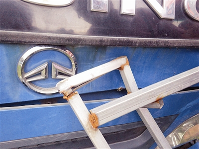 三轮车货箱底板副梁方形管材,其后端可以看到有碰撞痕迹。