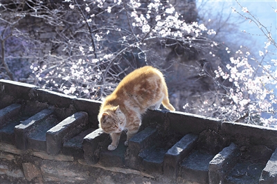3月21日,在河北石家庄市平山县天桂山,一只小猫在桃花与树旁嬉戏。