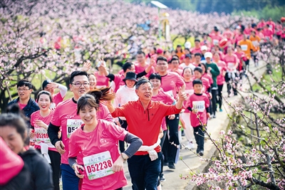 3月24日,2019奉化海峡两岸桃花马拉松在奉化区文昌阁广场浪漫开跑,8000余名跑步爱好者奔跑在桃花盛开的马拉松赛道上。