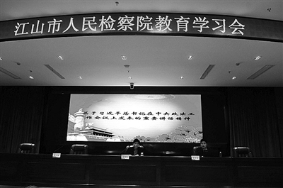 本报讯 近日,江山市检察院组织全体干警召开教育学习会,传达学习中央政法工作会议精神、学习解读《中国共产党政法工作条例》、学习落实江山“党建统领加强年、项目攻坚突破年、产业转型提升年”“三个年”活动会议精神。
