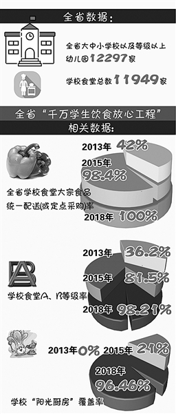 阳光厨房安全放心、大宗食品统一配送、校领导陪餐制……这一切,都源自我省开展的“千万学生饮食放心工程”。截至2018年底,全省学校食堂大宗食品统一配送(或定点采购)率达100%;学校A、B等级食堂比例达98.21%;学校食堂建成阳光厨房比例达96.46%。