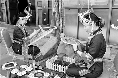 4月7日,即农历三月三,也是畲族的重要传统节日。当天,杭州畲族馆开展了第二届桃花节暨《爱我中华》三月三民族歌会节庆表演,少数民族同胞们穿着华丽的服饰从四面八方赶来,喜迎节日。图为畲族姑娘在畲族馆门前绣畲绣。