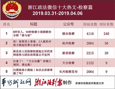 本期检察院热文榜中,“丽水检察”的《@所有人,90秒检察小视频教你分辨“黑与恶”》一文,阅读数和在看数均居第一。多才多艺的检察官通过幽默诙谐的小视频向大家讲述了扫黑除恶的小知识,接地气!