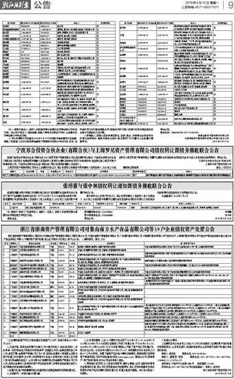 浙江省浙商资产管理有限公司对象山南方水产食品有限公司等19户企业债权资产处置公告