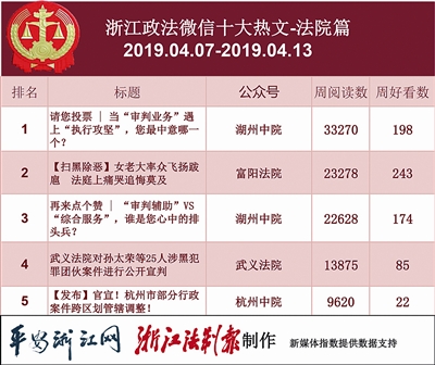 本期法院榜,杀出了“湖州中院”这匹黑马,它不仅夺得榜单第一,文章《请您投票 | 当“审判业务”遇上“执行攻坚”,您最中意哪一个?》也排名热文榜第一。原来,这篇热文的内容是湖州中级法院“十佳杰出青年,司法排头兵”的网络投票,还附有25位候选人的介绍,怪不得备受关注呢!