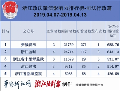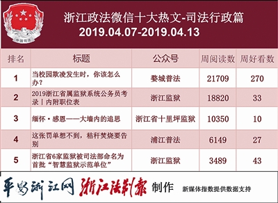 本期司法行政榜单上,排名前三的依次是“婺城普法”“浙江监狱”“浙江省十里坪监狱”。“婺城普法”的《当校园欺凌发生时,你该怎么办?》一文获得最高阅读量。这个话题虽是老生常谈,但事关青少年,所以关注度依然很高。