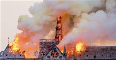 位于法国首都的巴黎圣母院15日傍晚发生大火,造成巴黎圣母院塔尖倒塌,建筑损毁严重。法国消防部门16日上午宣布,大火已经全部扑灭。新华社/法新