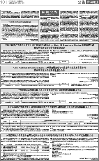中国长城资产管理股份有限公司上海市分公司与Grest Waterfall Investment Limited峰源有限公司 债权转让通知暨债务催收联合公告