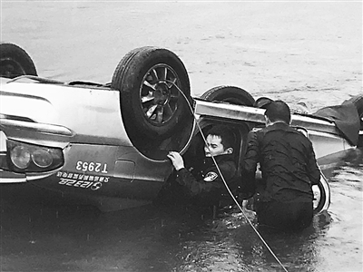 现场,这辆出租车在河中翻了个底朝天,司机和后排乘客已脱险,副驾驶座的乘客被困住无法动弹。现场已有2名群众下水,试图用钢筋拉住车子,防止水流将车冲走。