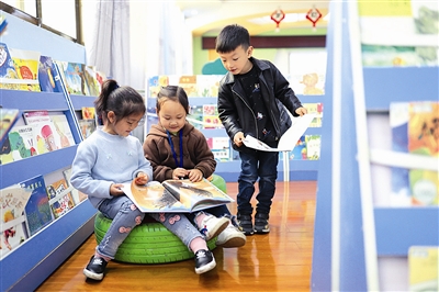 4月22日,在贵州省铜仁市玉屏侗族自治县平溪第二幼儿园图书室,孩子们在翻阅图书。